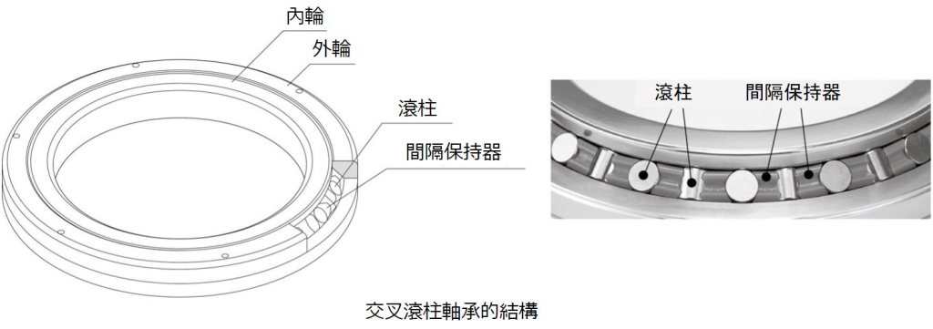 交叉滾柱軸承通過間隔保持器,在內外輪之間交錯配置了圓筒形滾柱,因此可以承受各方向的負荷(徑向負荷、軸向負荷、力矩負荷),並且可以獲得很高的旋轉精度。利用這些特性,交叉滾柱軸承被廣泛用於加工機和工業機器人等需要高剛性和高旋轉精度的設備中。